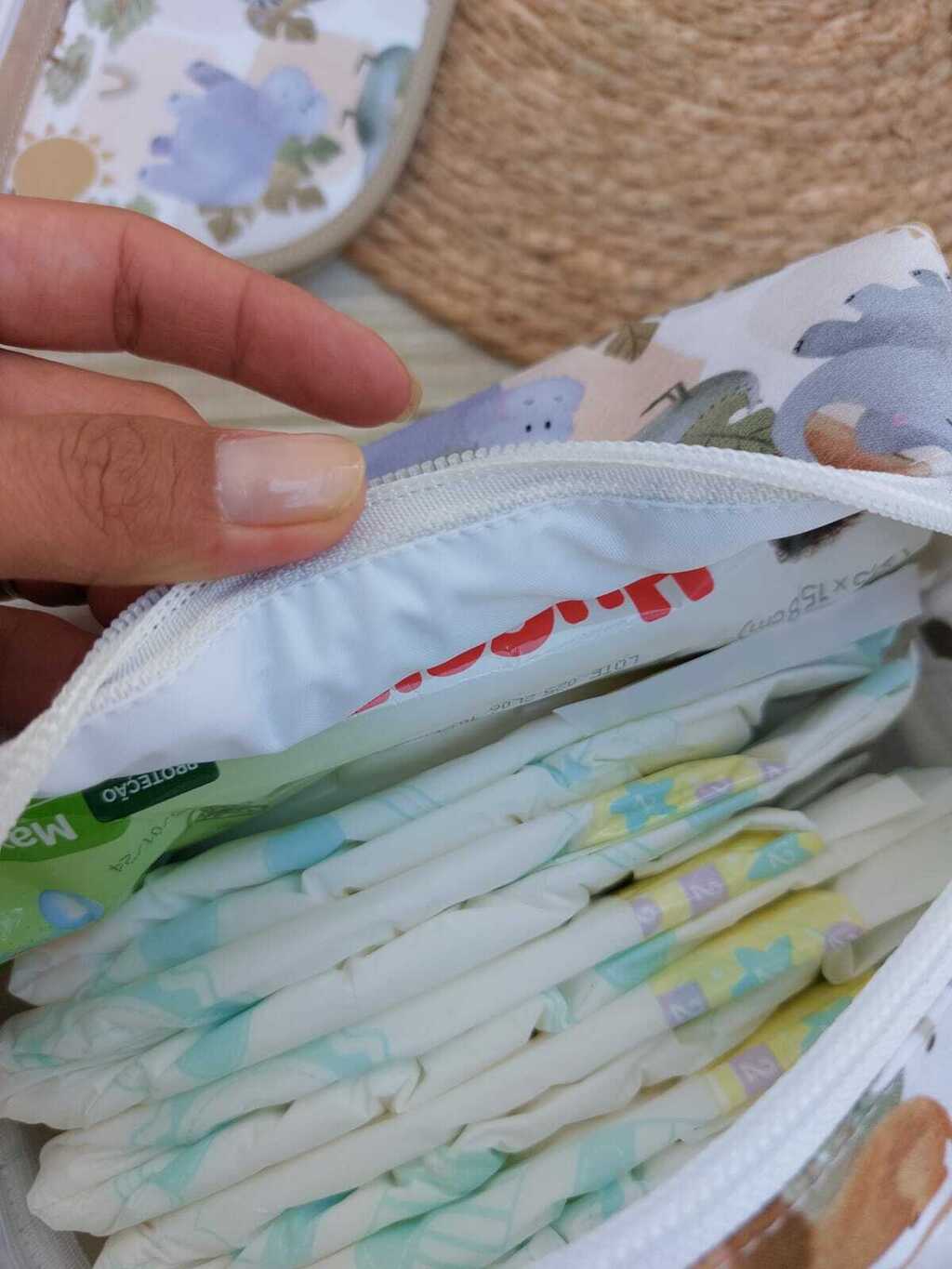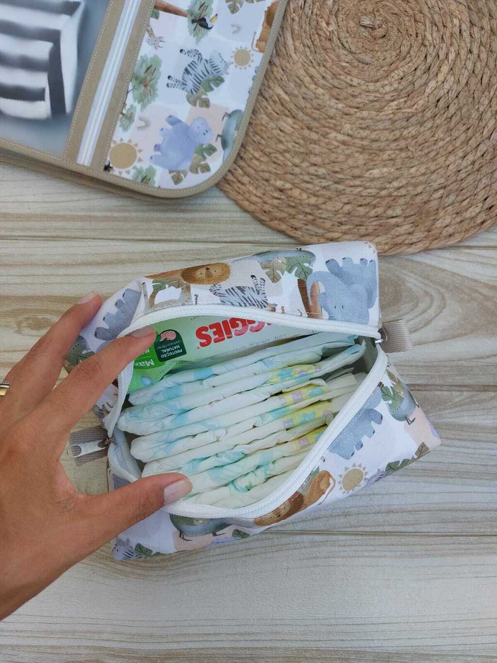 Ela pode ser usada como Necessaire hora da troca já que nela cabem até 6 fraldas tamanho P, lenço umedecido, pomada e ainda sobra espaço pra uma Fraldinha de Boca